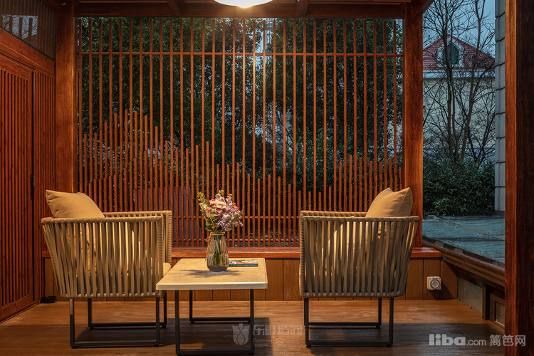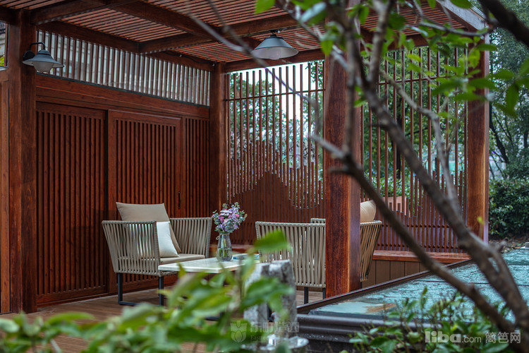轻巧的设计,镂空的廊架引入背后的树影婆娑,出人意表,却又和谐自然。