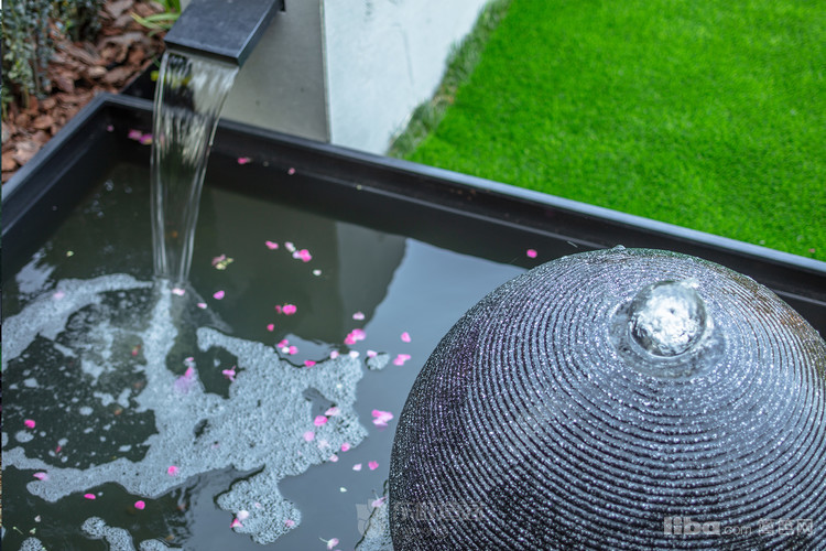 蓝绿色的水景墙和黄色砂砾区域变为花园的焦点,增添趣味的同时使得花园更加具有个性和特点。