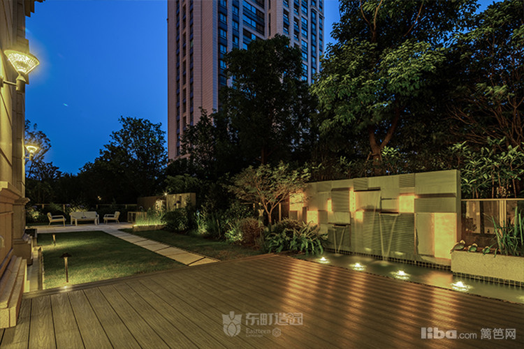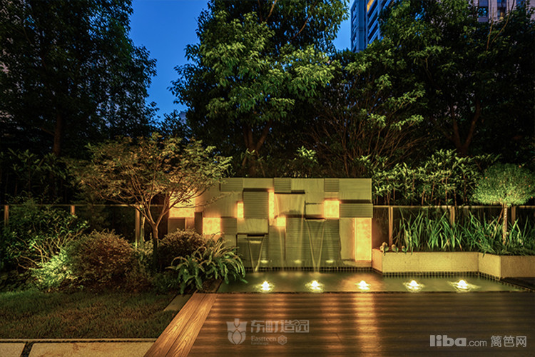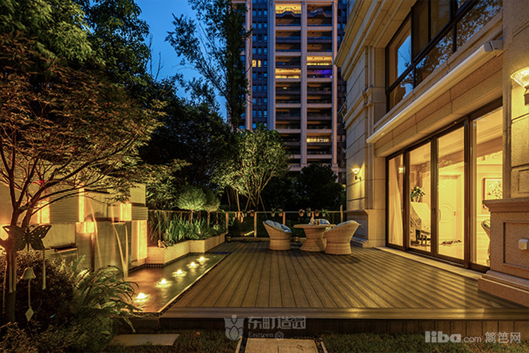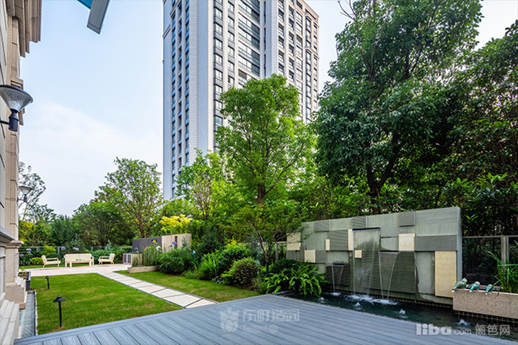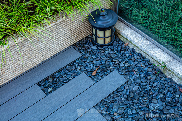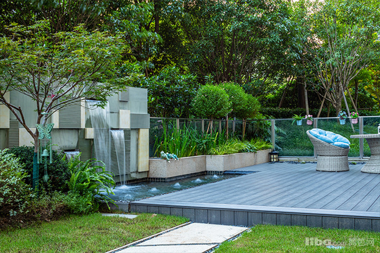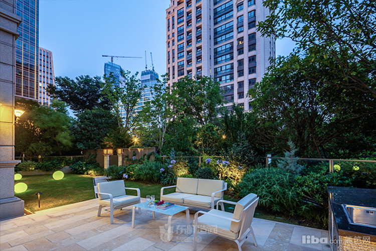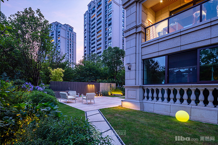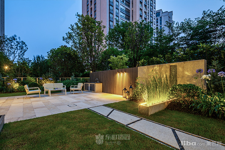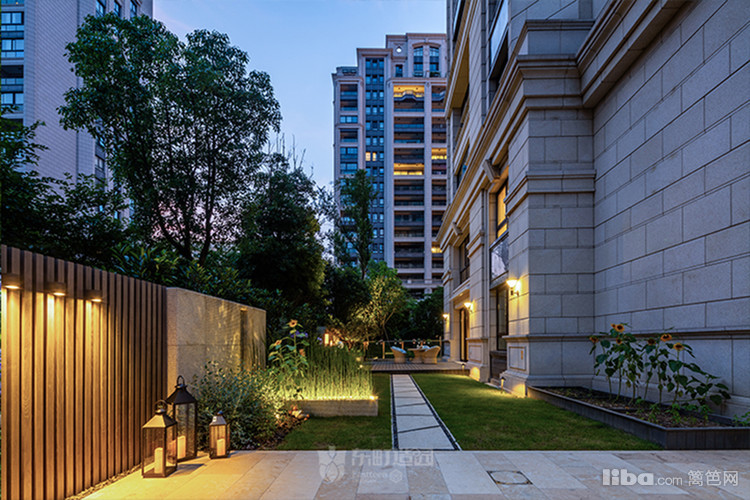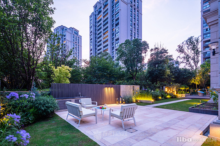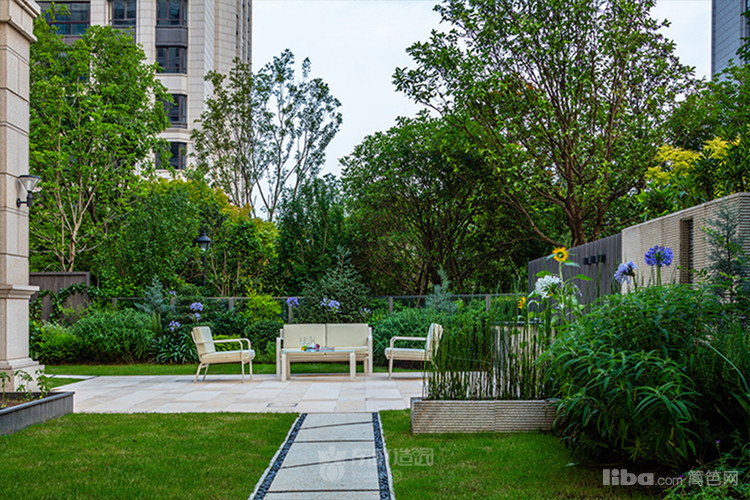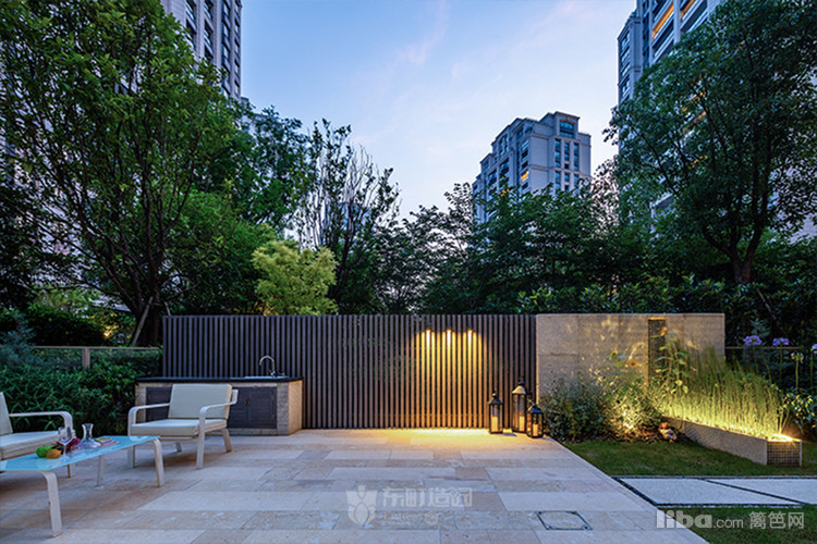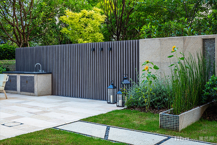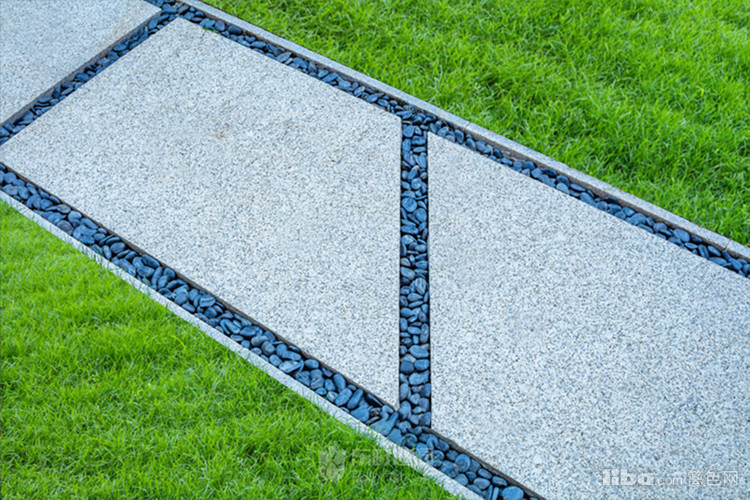 庭院中央以梯形汀步链接两个平台区域,简约的几何造型凸显了美式简约时尚的气息