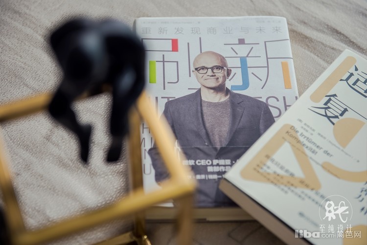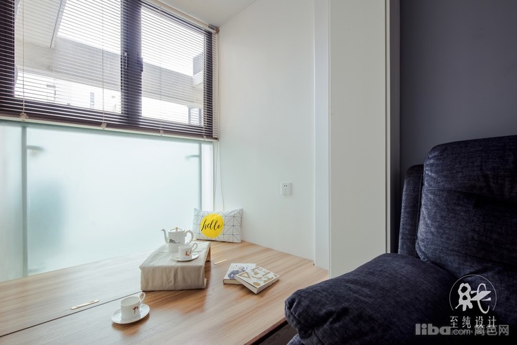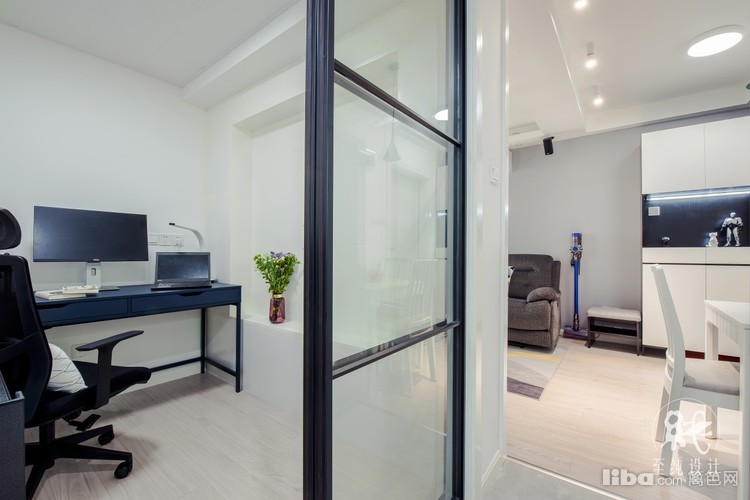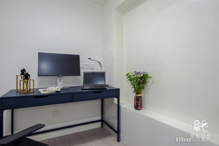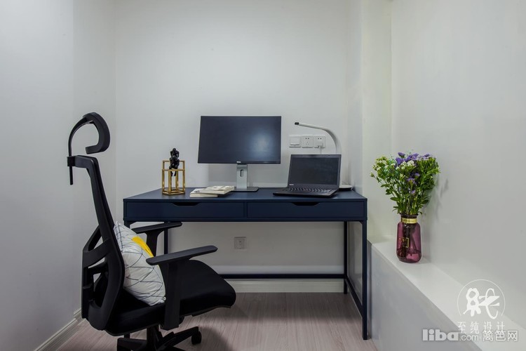 男主人有在家办公及阅读的习惯,重新设计后,将卫生间移出在至施工有保障的范围—外阳台,原卫则设置成为男主人的书房,黑色的书桌及办公椅,旁边放置花束,使整个空间变得轻松又简洁清爽。