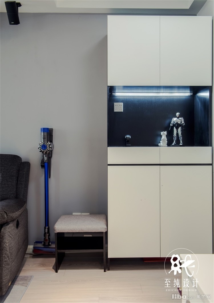 紧凑的客厅空间,展示手办模型;灰色背景墙,布置得实用休闲,充满了优雅舒适的气质。