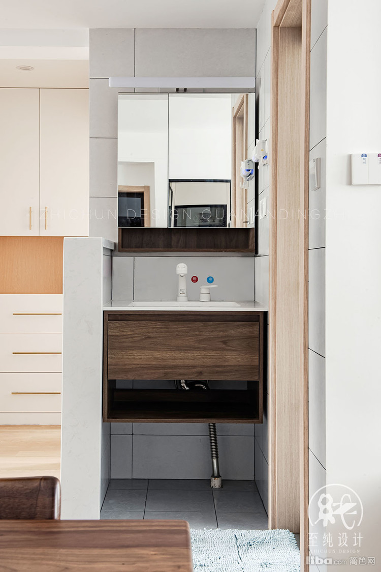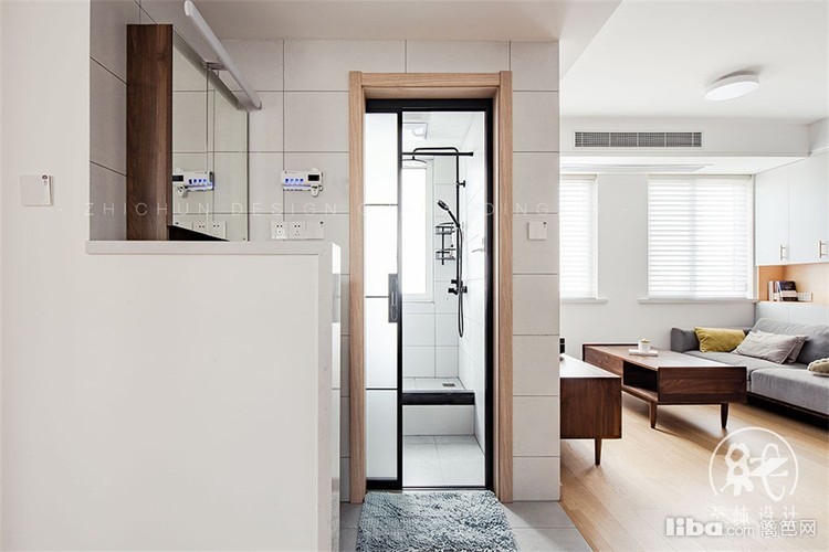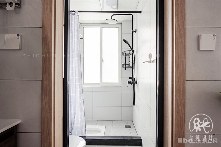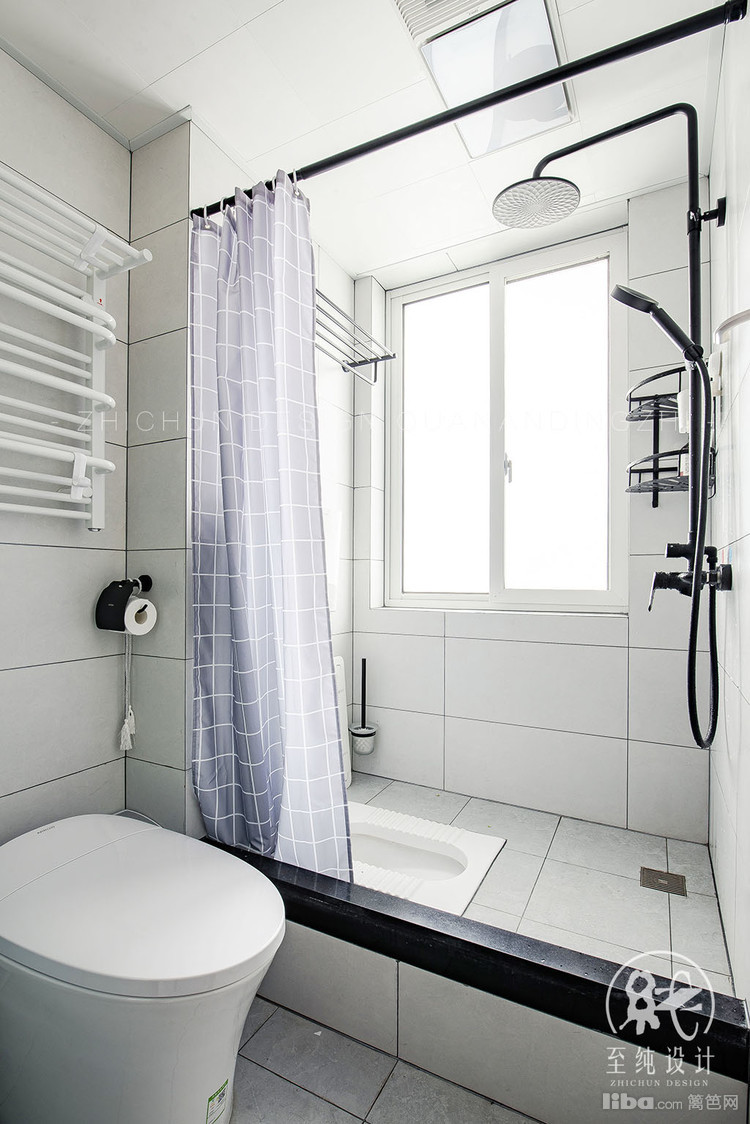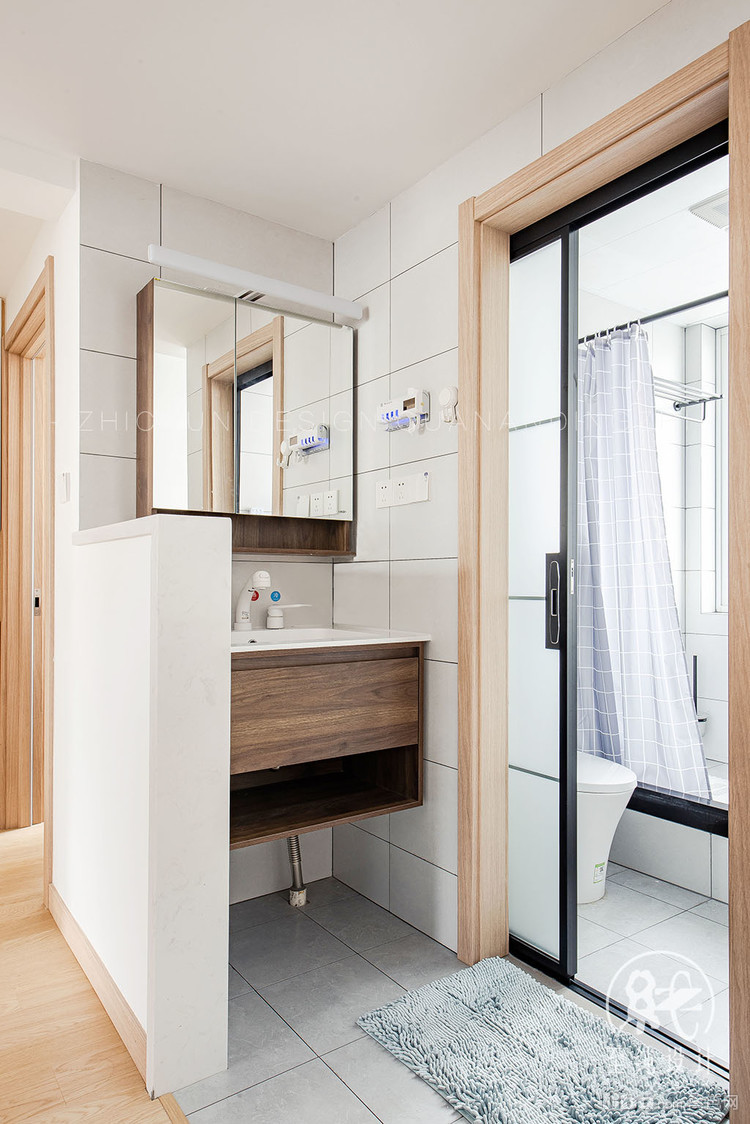 干湿分离,满足了父母过来卫生间的使用重叠。半高的墙面设计,保证了空间的通透性。客户有马桶和蹲便的需求,所以选择了淋浴区做了抬高,做墙排的蹲便