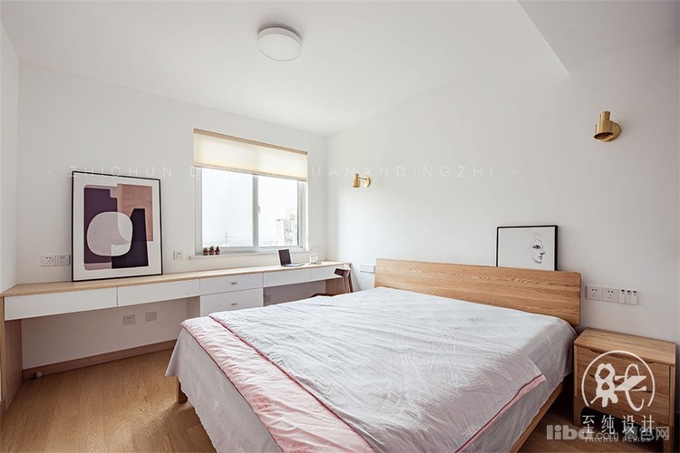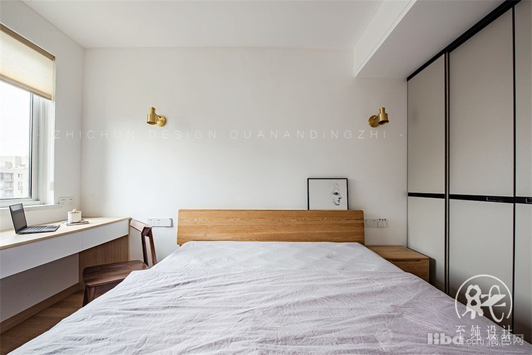 与儿童房的隔墙打掉,给主卧让了一个小衣帽间。靠窗一侧满打书桌,满足了客户两人共同办公的需求。
