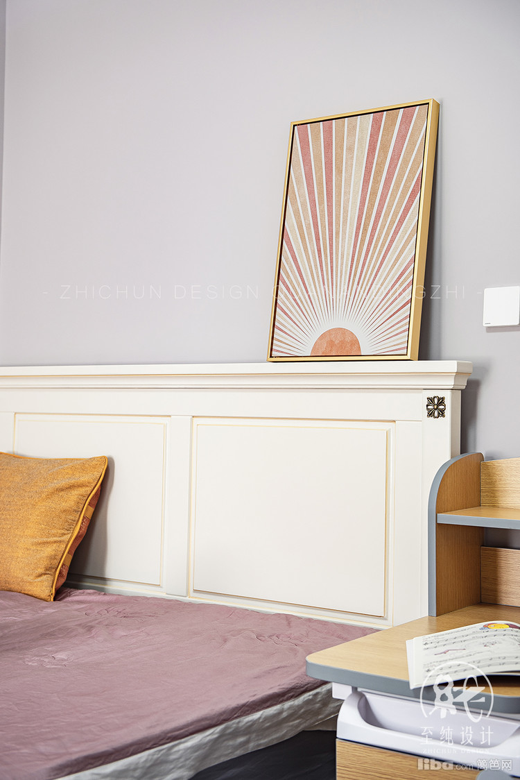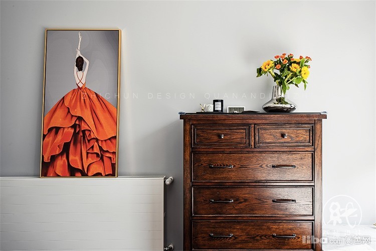 整体色调,客厅沉稳大气,卧室硬装简约平和,配以亮色的挂画和花艺;