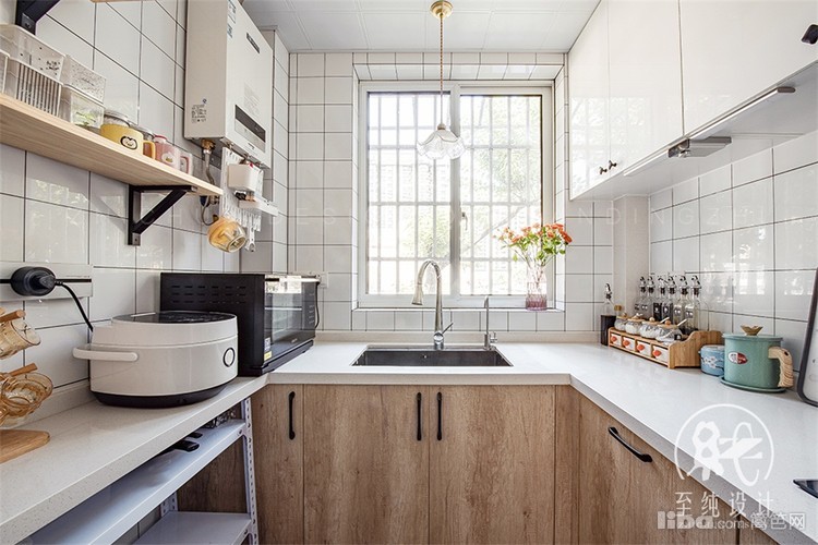 现在提倡垃圾干湿分离,故在开放的橱柜下面放了可储物的垃圾桶的位置,不破坏厨房的整体视觉感。