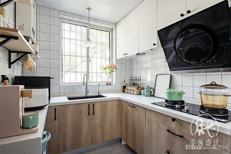 而厨房的橱柜上柜做了可充电(可拆卸)的灯带,晚上台面操作就不用背光啦,转角处做了开放式的转角置物架。