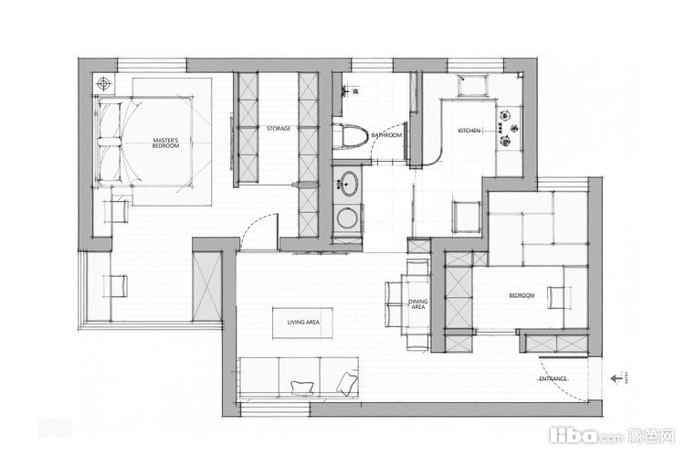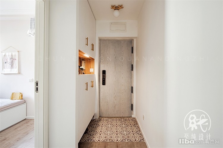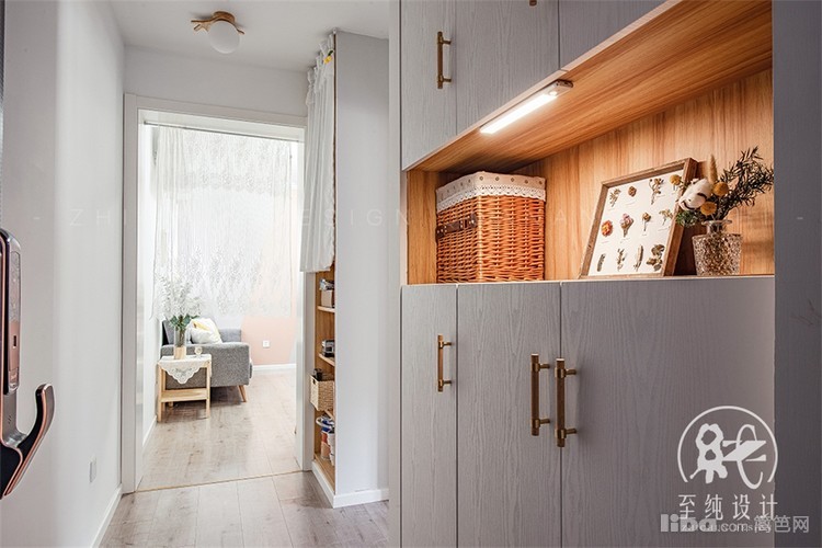 原客厅改为玄关+次卧,以一划二,把一个空间划分出两个区域。玄关,解决原户型没有合理放置鞋柜的问题;同时利用鞋柜隔出了一间次卧,