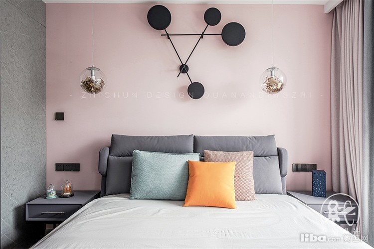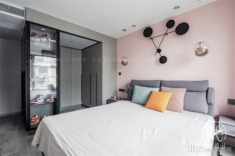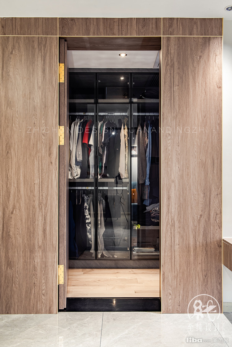 主卧室进门处直视这一个大衣帽间,为了让空间上显得更大,选择了用玻璃做门板,这样不会显得压抑,空间也得以释放,主卧背景灯可以营造氛围搭配两侧各一个的金色吊灯,层次感更加丰富。
