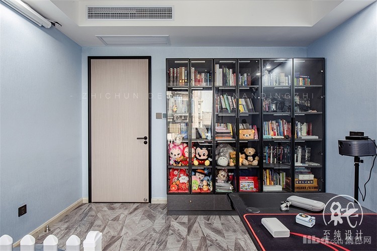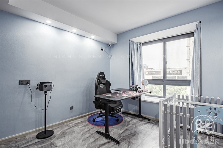 墙上布有投影幕布,满足一切幻想,结合电脑桌与电竞椅堪称办公、娱乐boy的天堂。