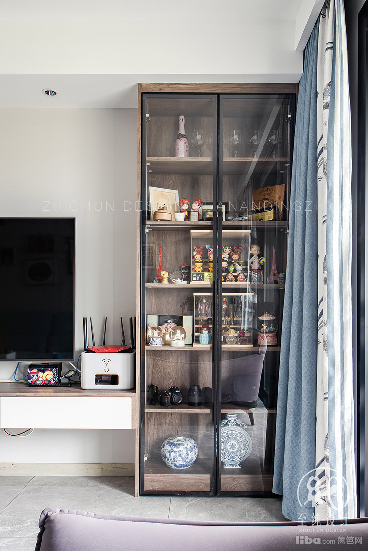 客厅做了四根线灯于延伸的墙体打造了一个光源很强的延伸感,整体墙面色调以灰色为主,电视机背景墙用木饰面结合展示柜一体成型,空间整体色调纵深感很强。