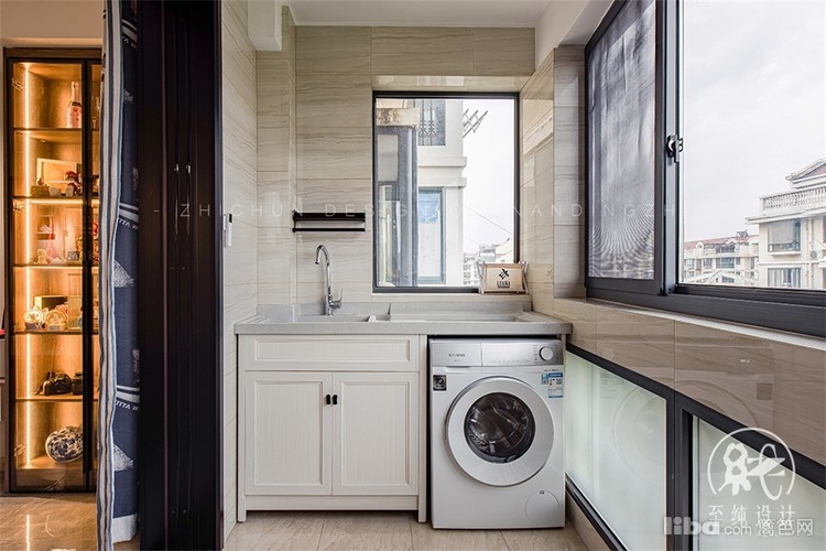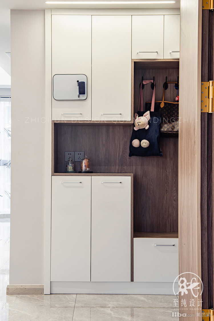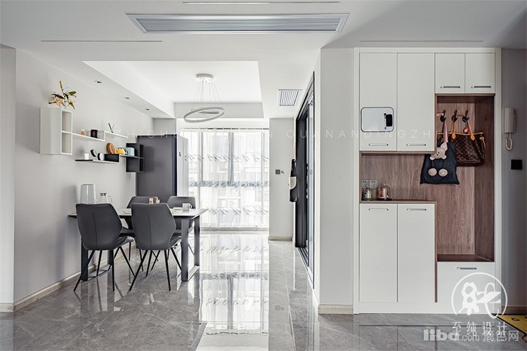 北阳台没加移门,视觉上把原本餐厅的空间扩大了些,为了增加厨房的实际操作台面以及储物空间,最后选择了把双开门冰箱从厨房拿到了餐厅,结合墙上的餐边柜,整体不会显得过于突兀。