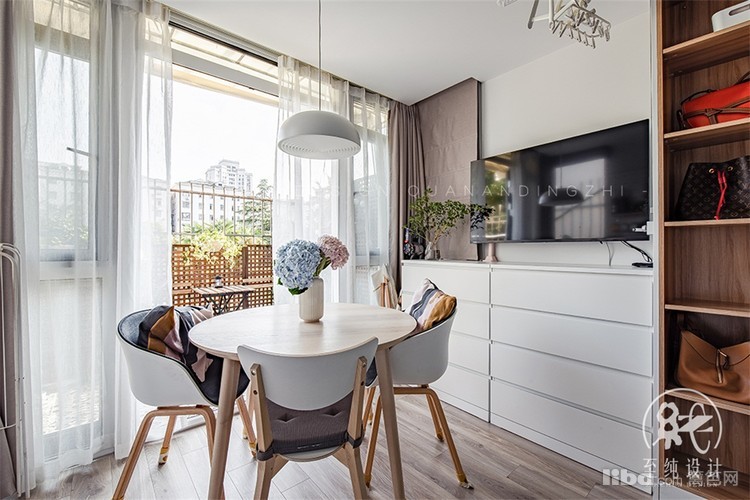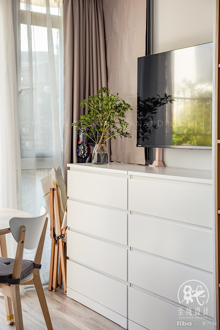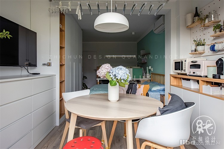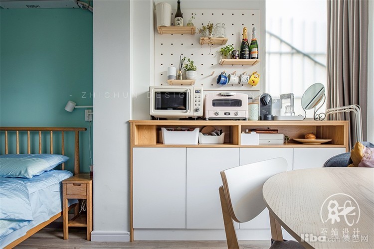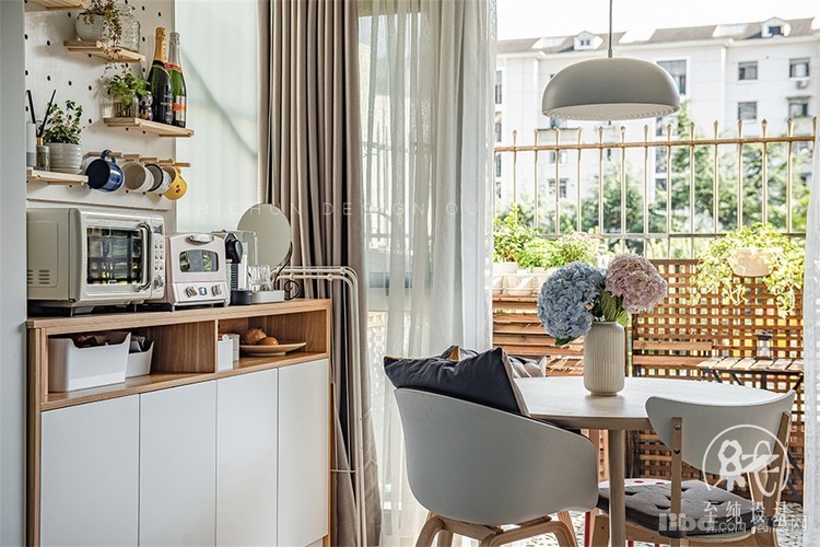 一室户的格局没有独立的客餐厅,借用阳台区域兼顾了客餐厅功能,午后来杯美式,听着音乐看着自己喜欢的书籍,是一件多么惬意的生活。