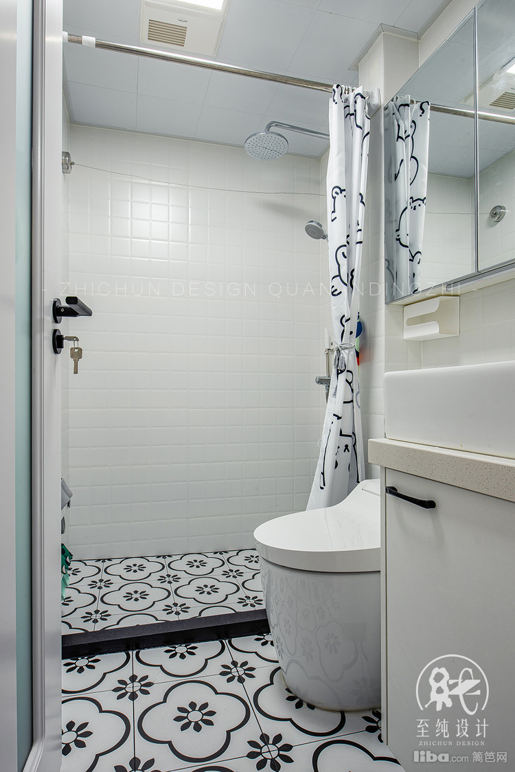 而考虑空间有限,故设计了正面的镜柜,化妆品及护肤品也有了落地安家的空间。