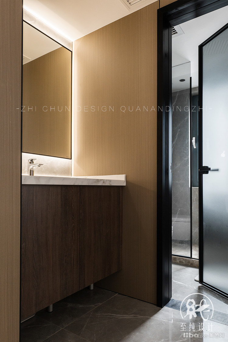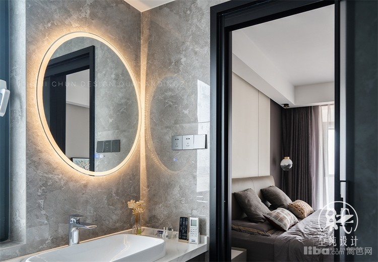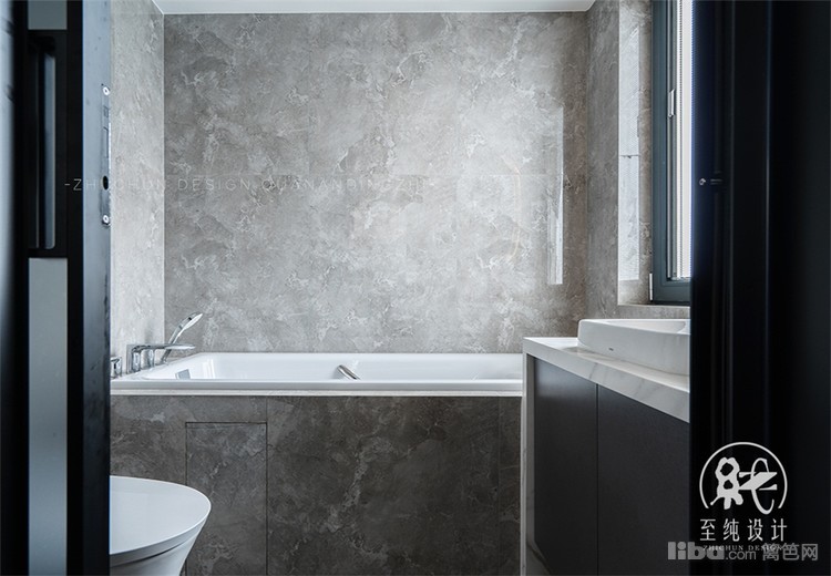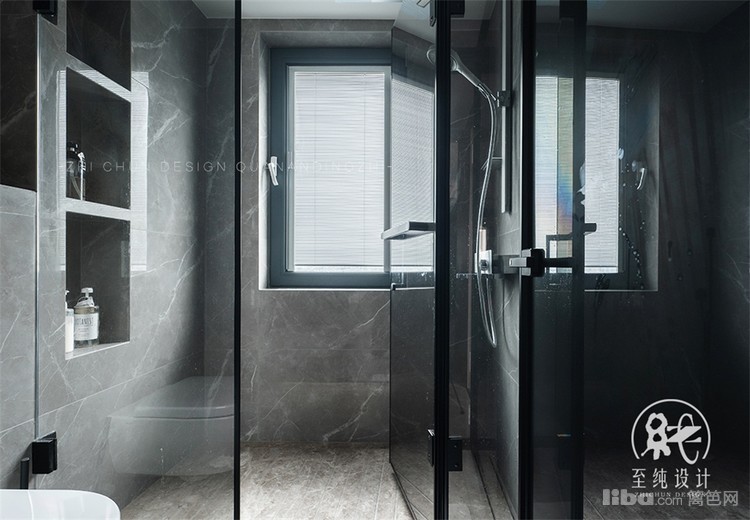 卫生间全部采用600*1200大砖上墙,客卫淋浴房,主卫浴缸,淋浴泡澡两不误,客卫干湿分离,马桶采用壁挂式,和淋浴房里面的壁龛合成整体;单扇开门加上磨砂质感