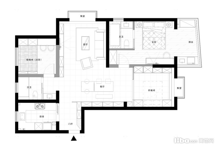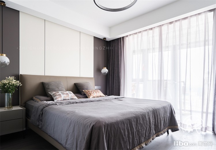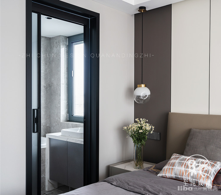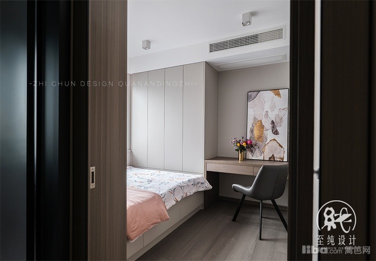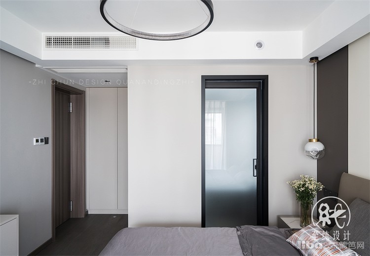 原户型主卧空间比例不是很协调,故此次设计主卧重新规划,大方向不动,仍然是套间设计,原主卫的弧形门槛往内移位借此调整主卧空间比例,但主卧不用留大衣柜空间。