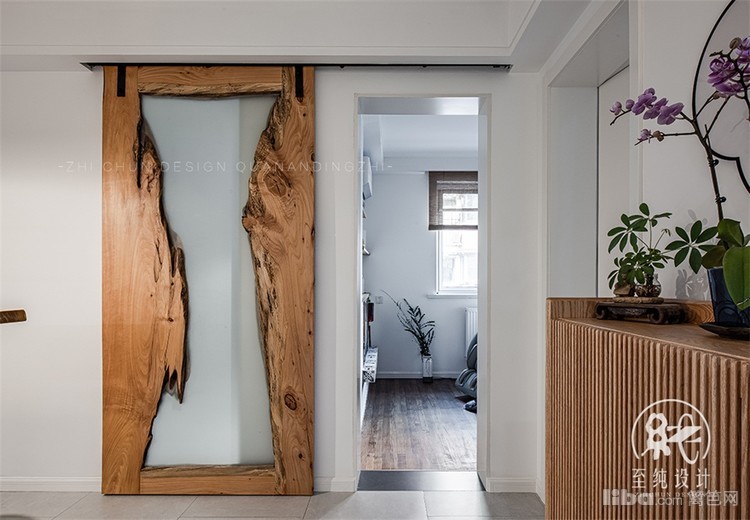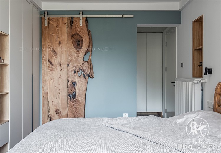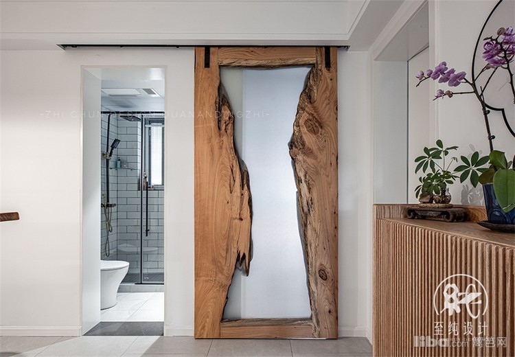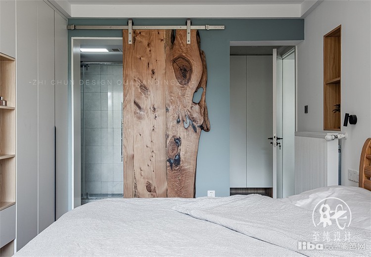 一道上轨实木谷仓门把主卫和主卧相互分隔,起到房门作用外,整个空间也因为有了它更加稳重、朴华。