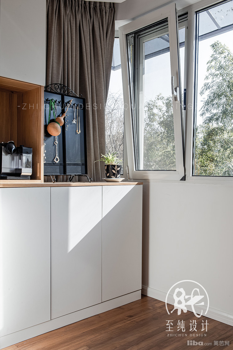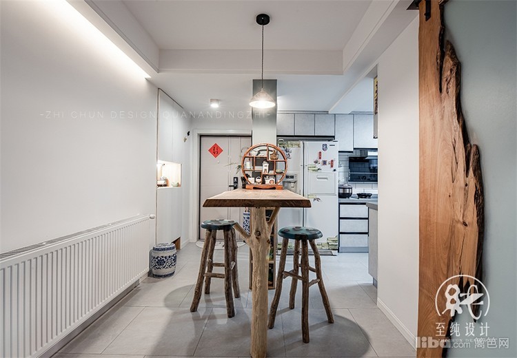 平时夫妻2人一起就餐比较多,摒弃了常规餐桌摆放方式,做了实木吧台,留足了狭小餐厅的活动空间。