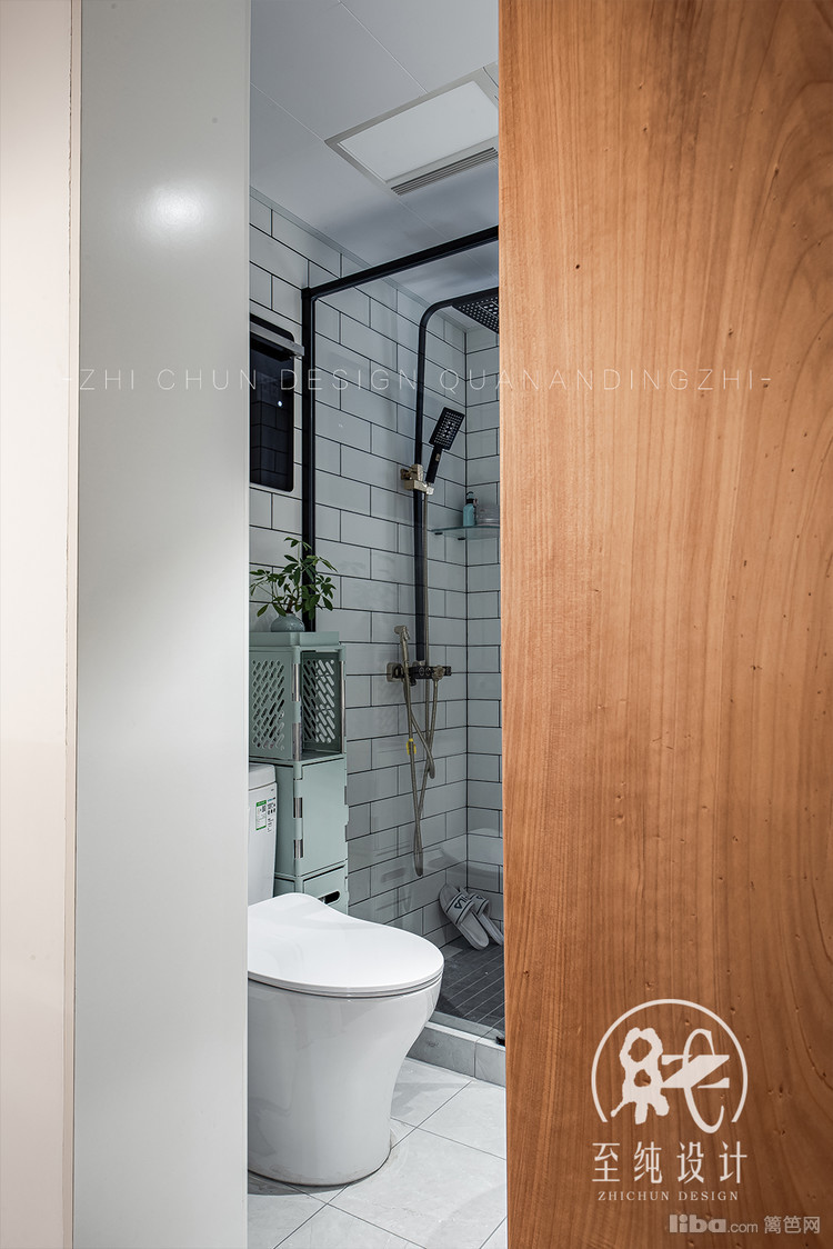 一镜到底,筒灯+浴霸的组合担负次卫整体照明。翡翠绿+小白工字砖相拼结合,悬空台盆柜打扫0死角。