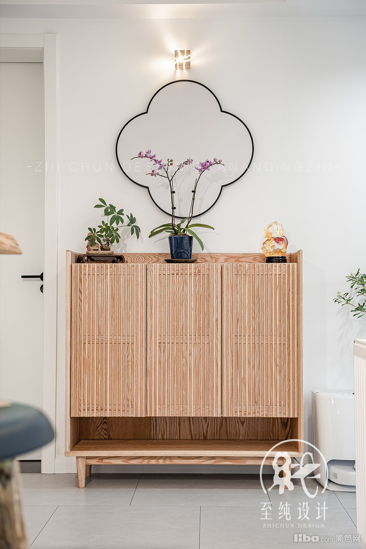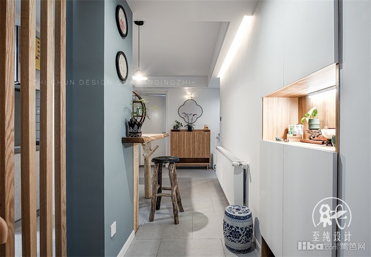 入户玄关把进门方向墙体敲掉,右侧门洞做鞋柜。保证整个空间开放且与其他空间相连而又相对独立。