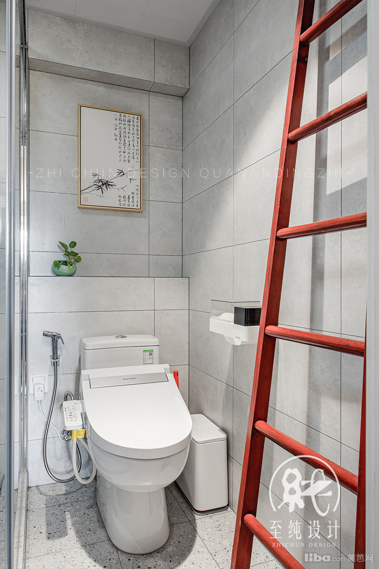 合并后的厨卫一分为2,1/4+的空间规划为衣帽间,考虑卫生间平时水汽,衣帽间的顶使用长条铝扣板,孔状的选择更透气、细腻;悬空的衣帽柜离地设计让地面0死角,日常打扫更方便。
