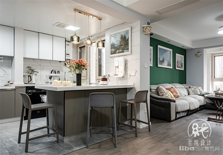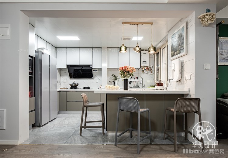 原有的餐厅区域想空出来给小孩作为玩乐区域,所以就把现在的中岛做成了既可以做岛台,也可以兼顾平时吃饭的功能性桌,实用方便,视觉上也增加了进门的衍生感。