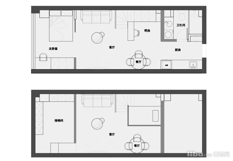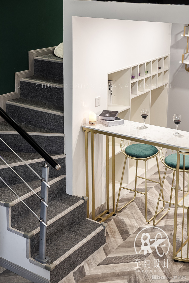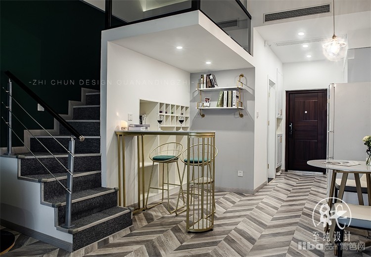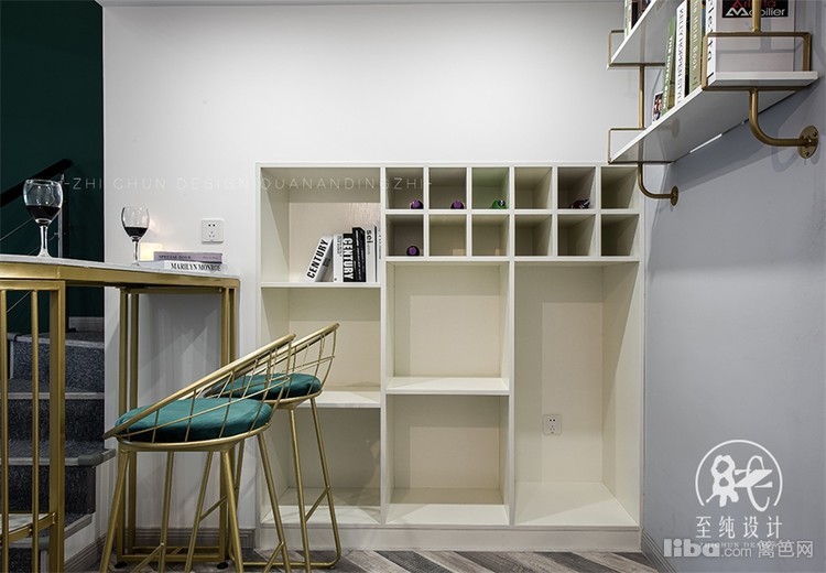 错层下设计了开放式的一个小小休闲区:造一处悠然自得的空间,安放不羁的灵魂-----吧台的设计既可以满足一个人的时候吃简餐,同时朋友来了也可以在一起放松畅饮。