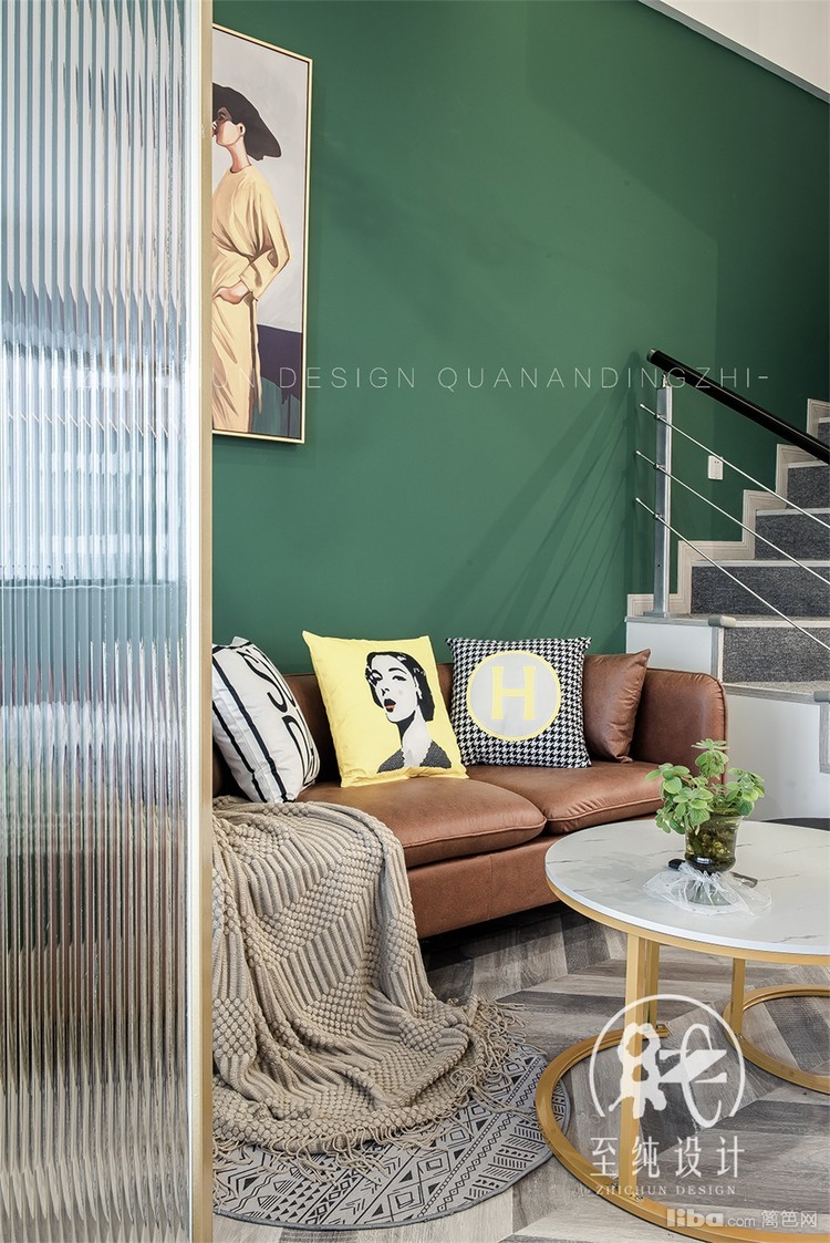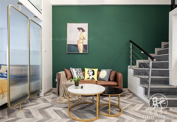 客餐厅的区域保证原有层高3.5米,在配色上,大胆的选择了深绿+棕黄的自然系配色,碰撞出一个复古自然系的家;顶部的金属魔豆灯以及铜色的金属拉手,加以点缀,为空间增添了精致轻奢的韵味。