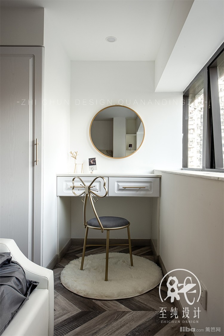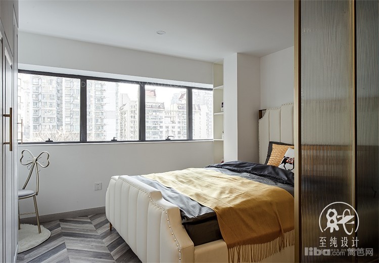 两扇可以旋转的金属边框的长虹玻璃隔断,给主卧增加了一些私密性,同时也不会影响客厅的采光。床对面的梳妆台可以满足女孩子平时化妆的需求。
