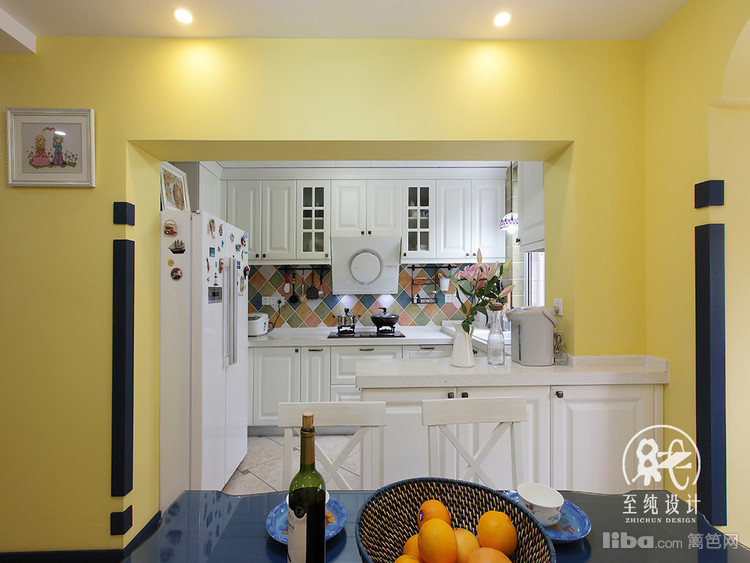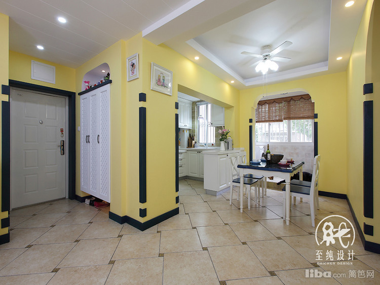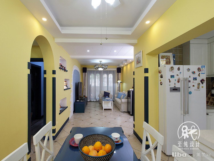 客餐厅:护角,墙角,是容易碰撞的点位,鉴于风格要求及避免后期家具 移位摩擦,导致墙角损坏,设计师特考虑用蓝色木质护角条进行修饰。