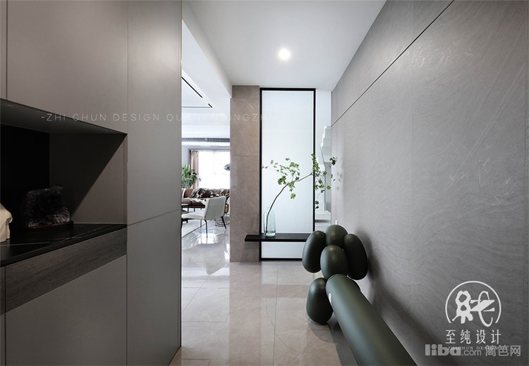 采用长虹玻璃做进户玄关,隔离不断的设计,增加视野的纵深感和通透感,线条感十足,左侧为鞋柜收纳区域。