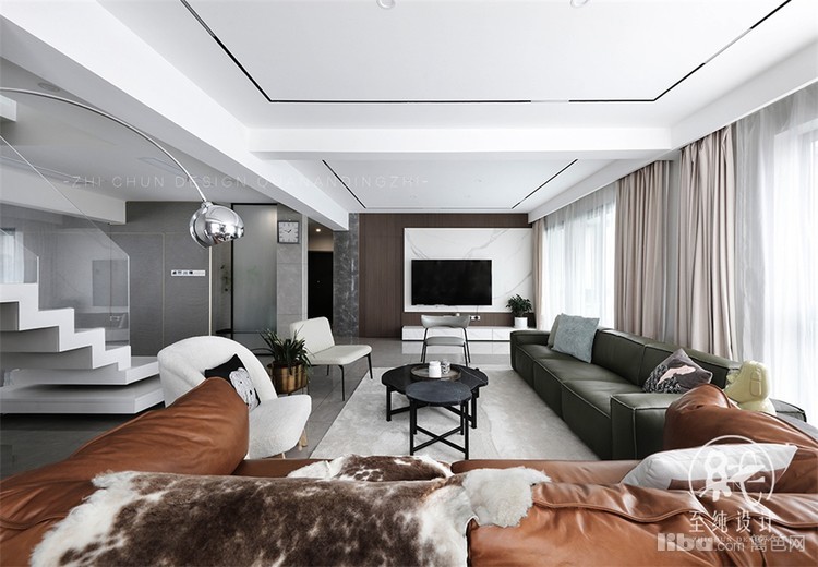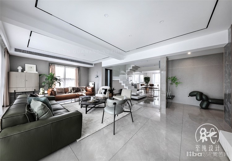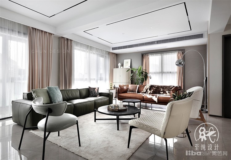 客厅采用围坐+无主灯设计,形成空间互通,且没有分割感。