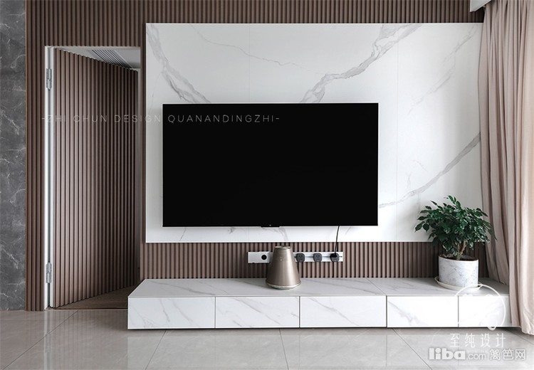 次卧室房门做隐形门设计,入户与电视背景墙连成一体,使得客厅的视觉整体上更为统一。