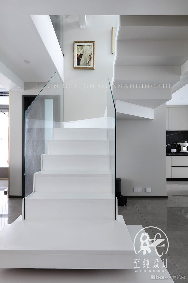 墙面大面积采用护墙板,增添质感,减少踢脚线的存在感;楼梯采用悬浮式楼梯设计,位于客餐厅之间。