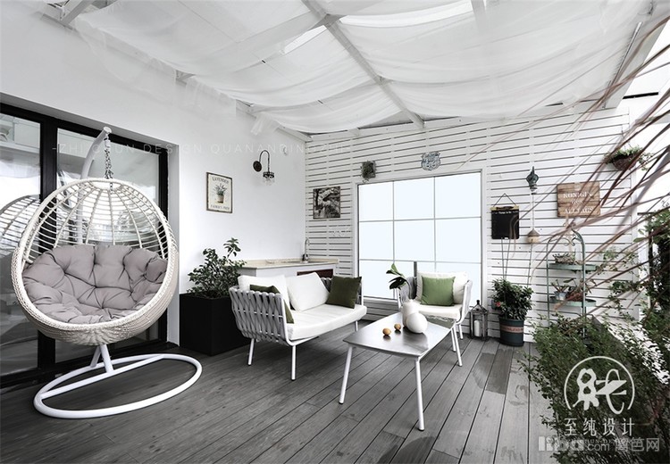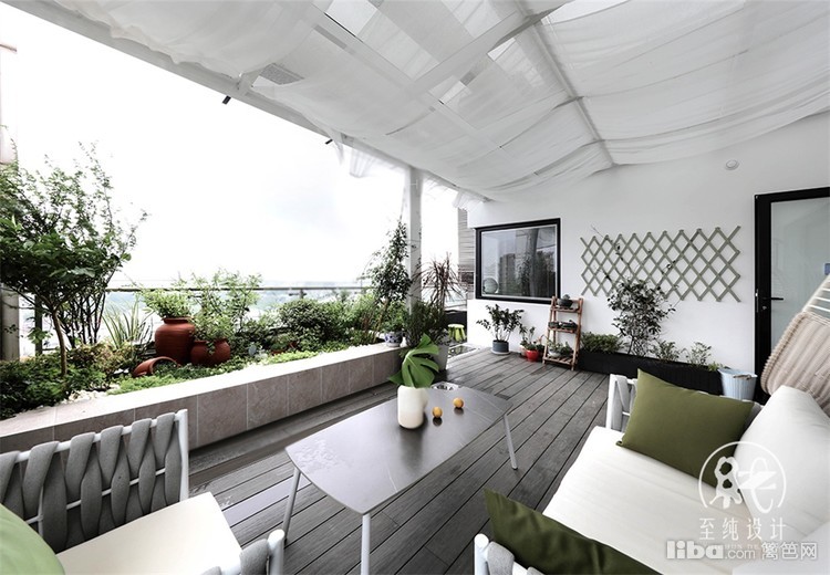 楼下阳台做整体的休闲观景阳台,楼层高,视野望去毫无压抑之感。