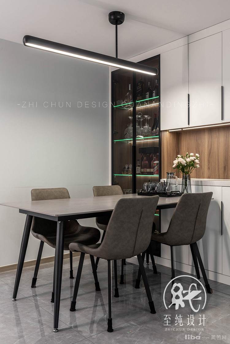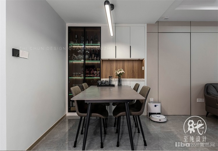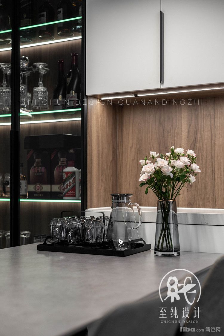 借墙体的厚度增设内嵌式独立酒柜,透过玻璃门板,收藏的美酒若隐若现,