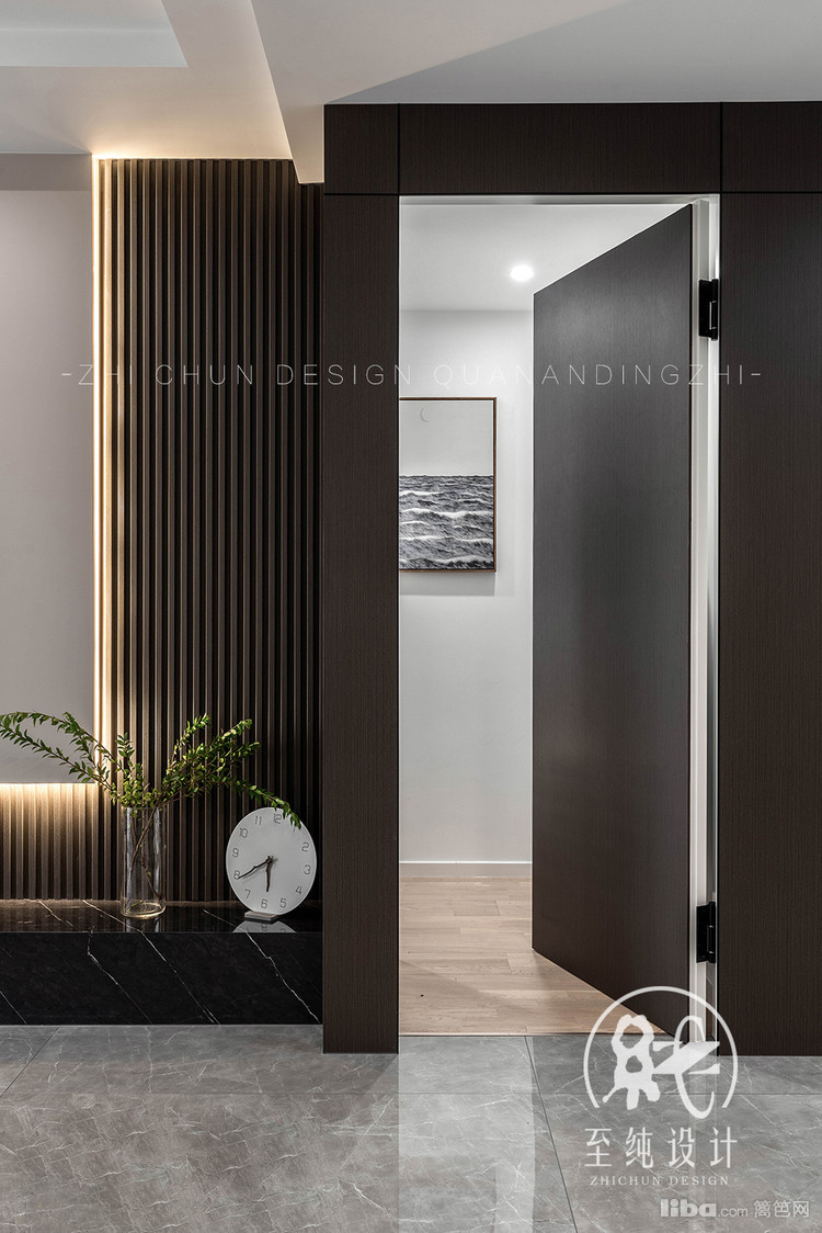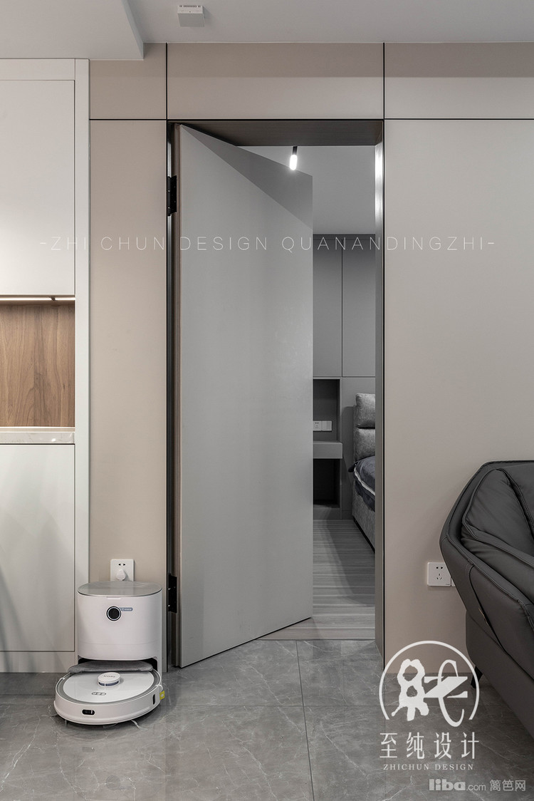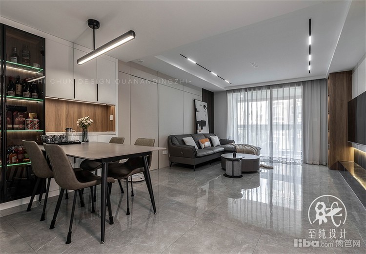 采取无主灯设计,全屋满吊顶内嵌式磁吸轨道灯,增加空间流动感。同时墙面到顶一根内嵌灯带,从玄关处看客厅,视觉上进一步提升空间延伸感。