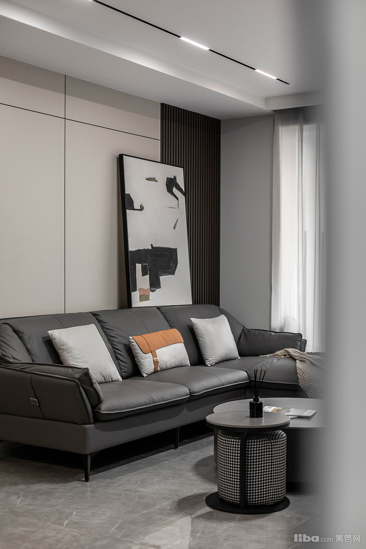 为保证视觉及空间的完整性,借电视背景墙次卧入户做了隐形门设计,和电视背景墙连成一个整体。质感满满的皮沙发,极具设计感的茶几,既交织出空间的高级气质,又不失家的减压舒适。