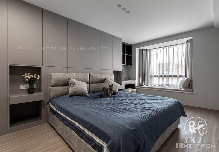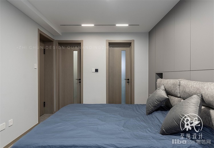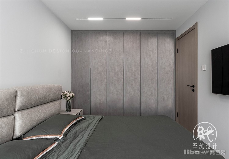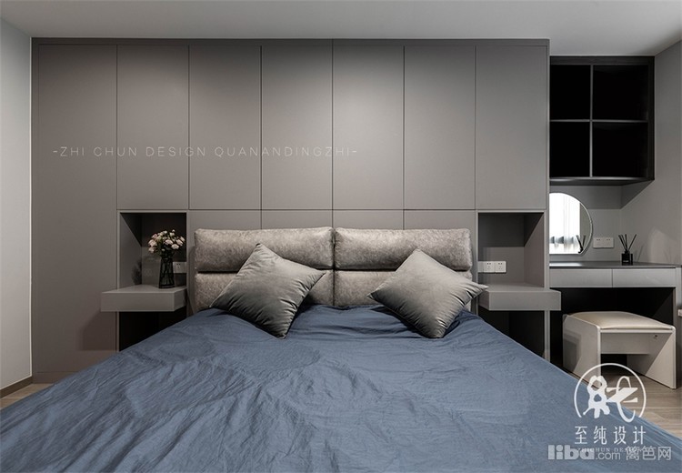 主卧以套间设计展开,除增设衣帽间,借空间纵深优势在床面背后增设一排衣橱,既避免空间存在的压抑感,收纳功能也大大提高。