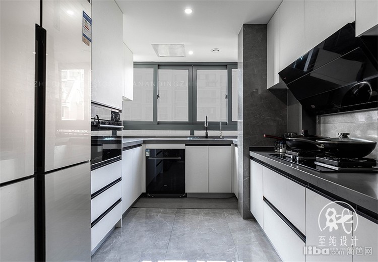 厨房的三移门全部折叠收在冰箱的侧面时,实现厨房开放性,空间通透与流动感更畅通。