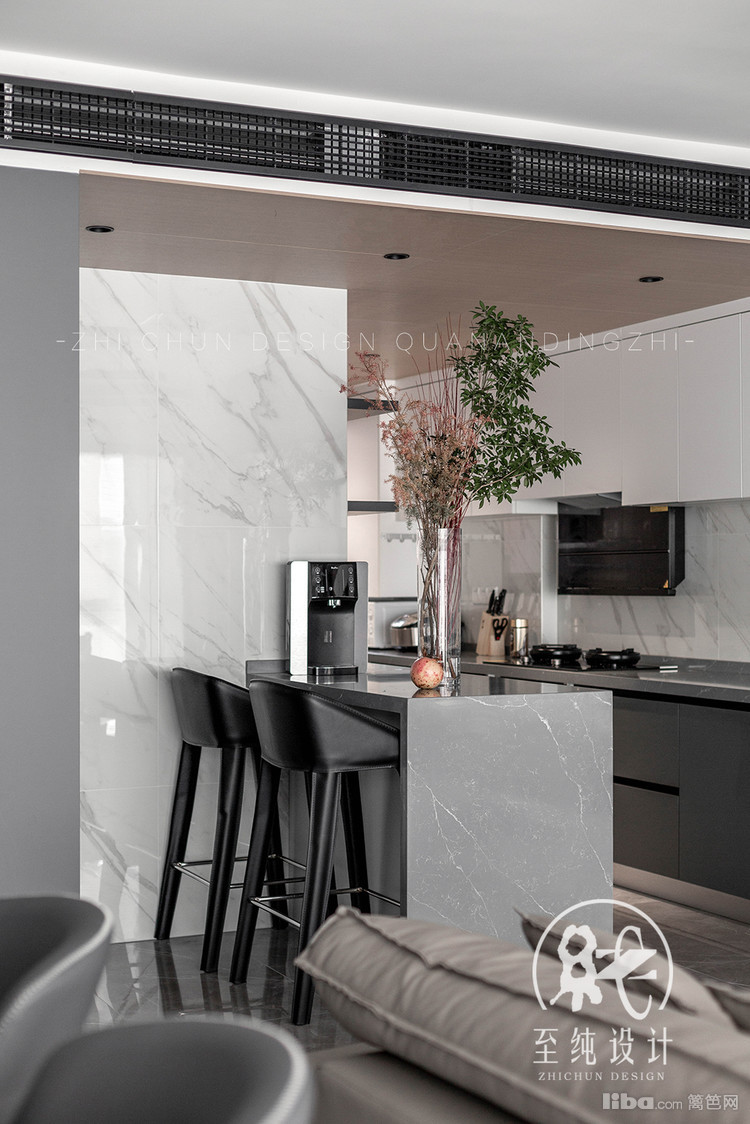 整排黑白根大理石电视柜,且无限放大视觉空间,在用色上,又与餐厨区相呼应。