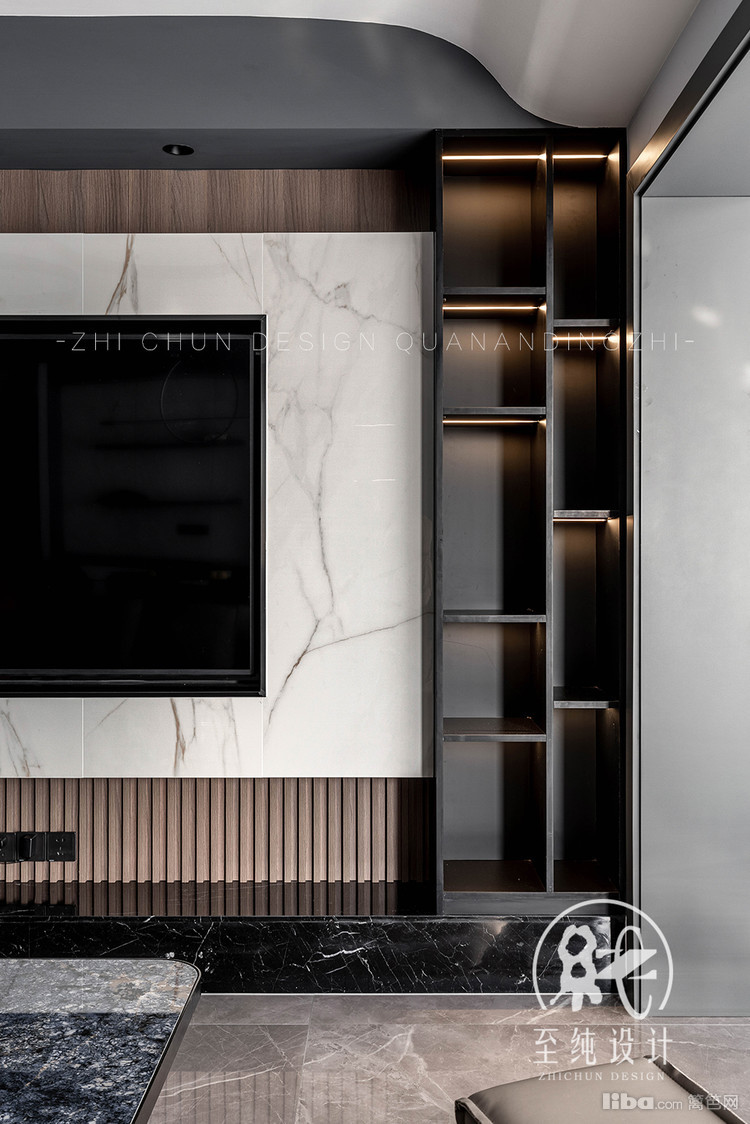 经典黑的电视内嵌其中,自然地与背景融为一体,视觉更显大气统一。