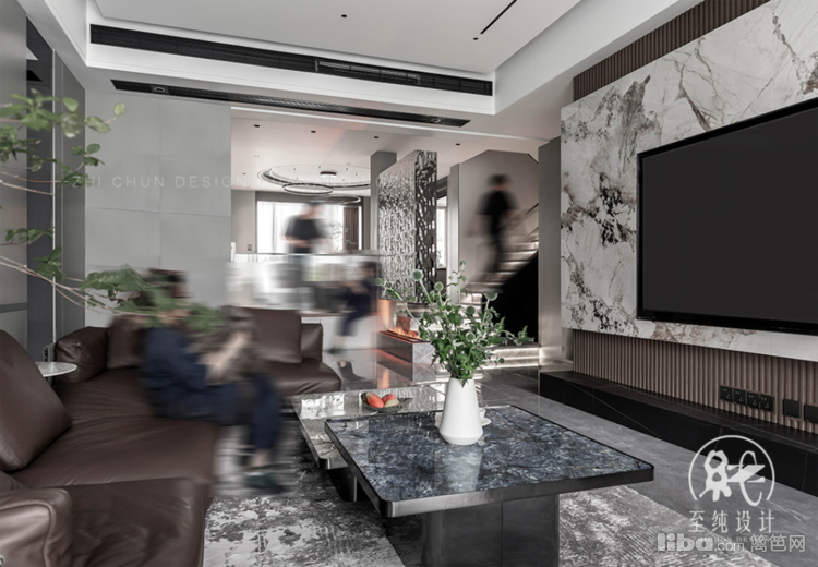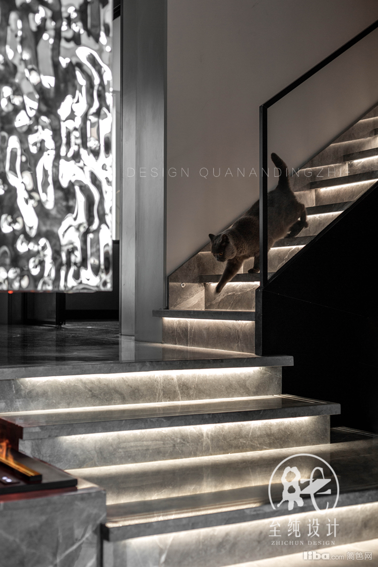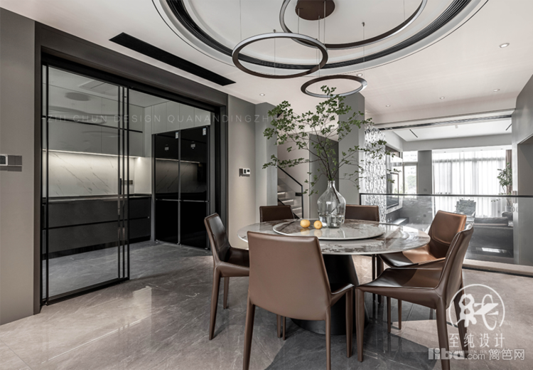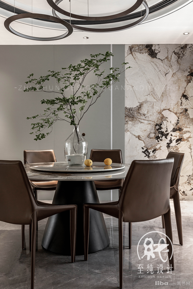 圆桌与顶部的圆形勾勒,流动涟漪,并与玄关立面的水波纹不锈钢镜面彼此呼应,视觉与精神,一脉相承。