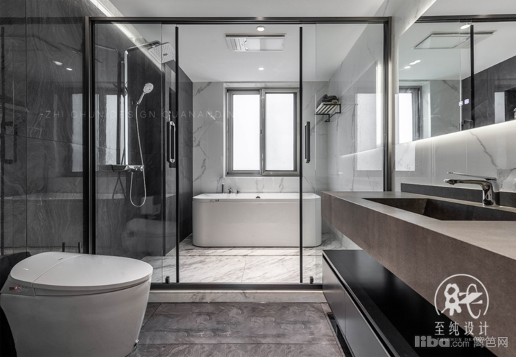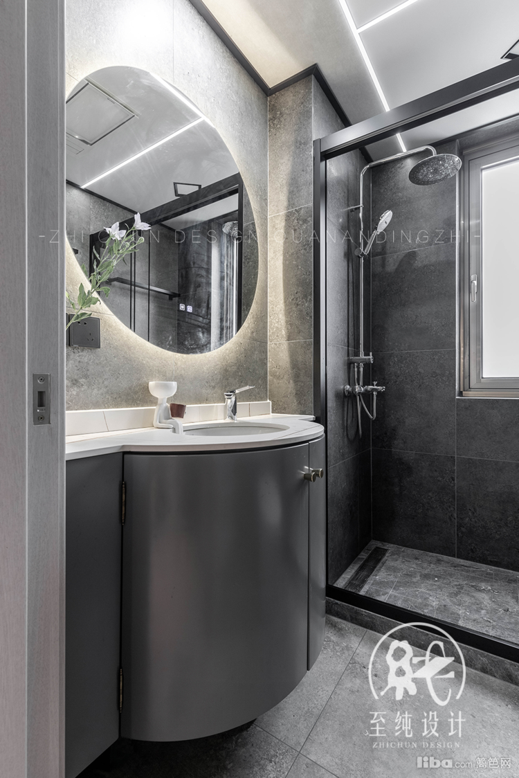 卫浴室回归至简至美的纯粹,干净利落的高级,最青睐黑白二色的对碰。黑色岩板以一己之力,承担下格调。