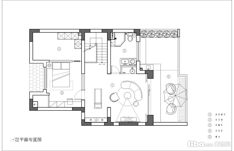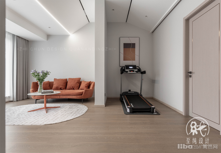 功能上把健身、视听、品茗多种功能一体化。和露台紧邻,可以作为娱乐区(看电影、投影),又可作为健身区域