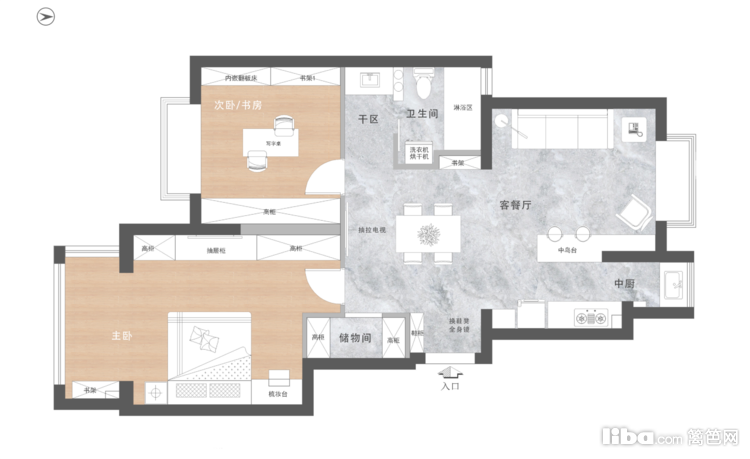 卫生间舍2合1做干湿分离,同时家里用水集中于卫,以增加卫生间的私密性。