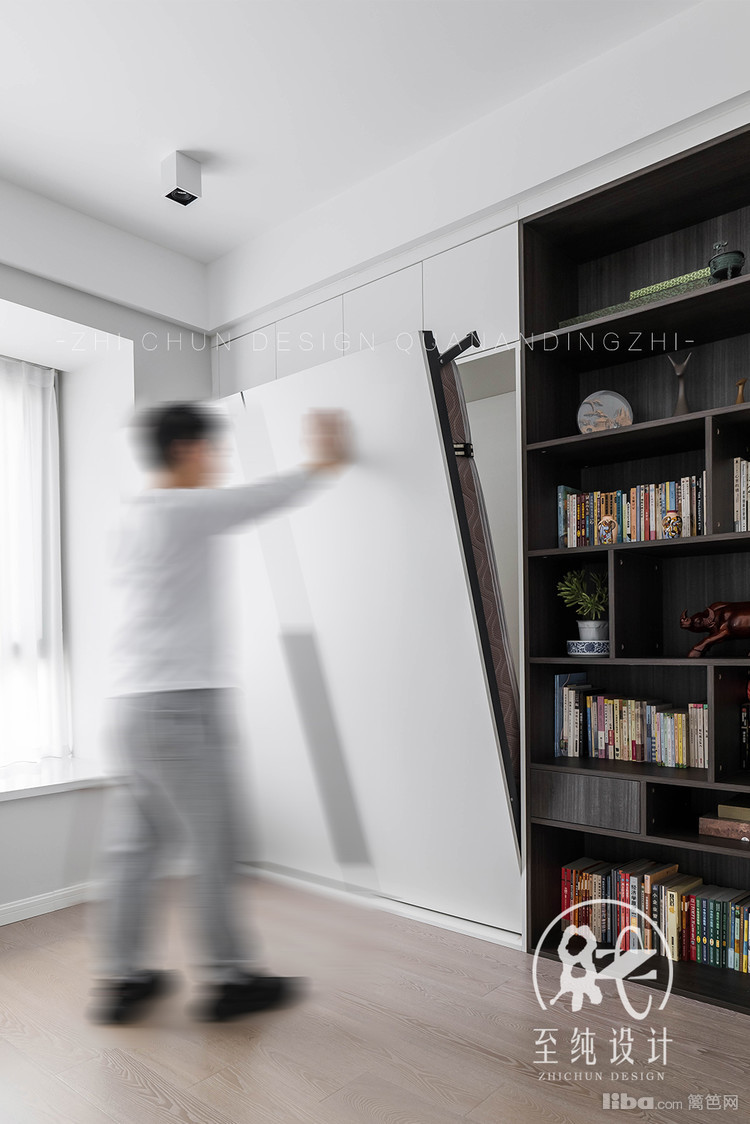 与书架齐平定制内嵌翻板床,房屋常驻老两口,女儿已定居香港,节假日回家时书房变身次卧,一屋两用。