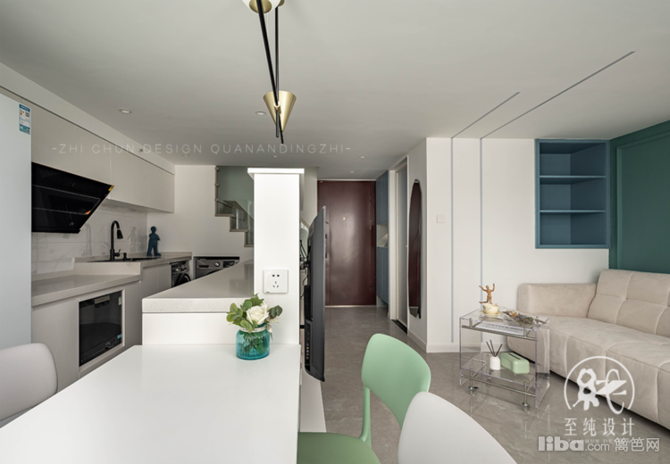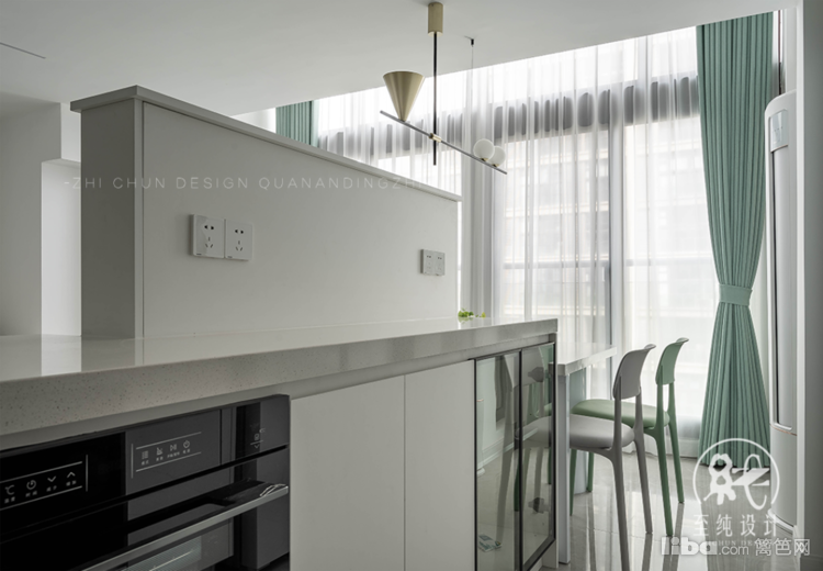 空间有限,设计无限。有限的空间里,岛台与餐桌连为一体,既可以作为无形的隔断划分客厅与厨房,一厅三用