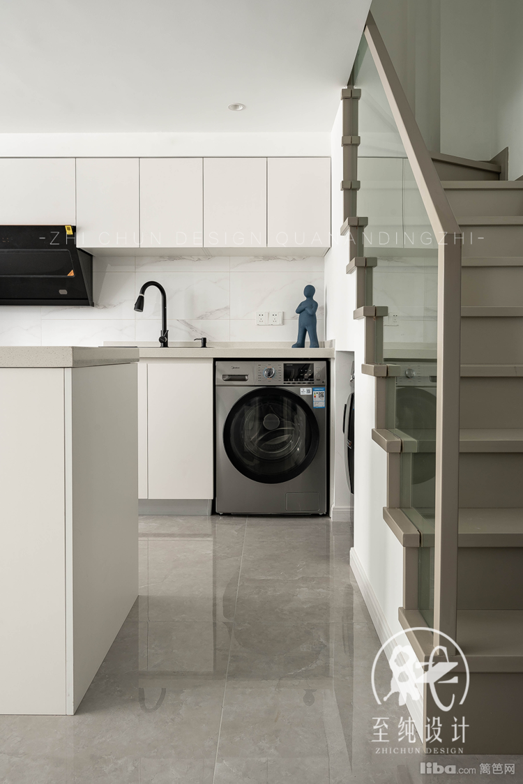 一字型厨房做高低台设计内藏洗衣机,转角嵌入烘干机更巧妙的和楼梯相结合,以此楼梯下的空间也有了用武之地