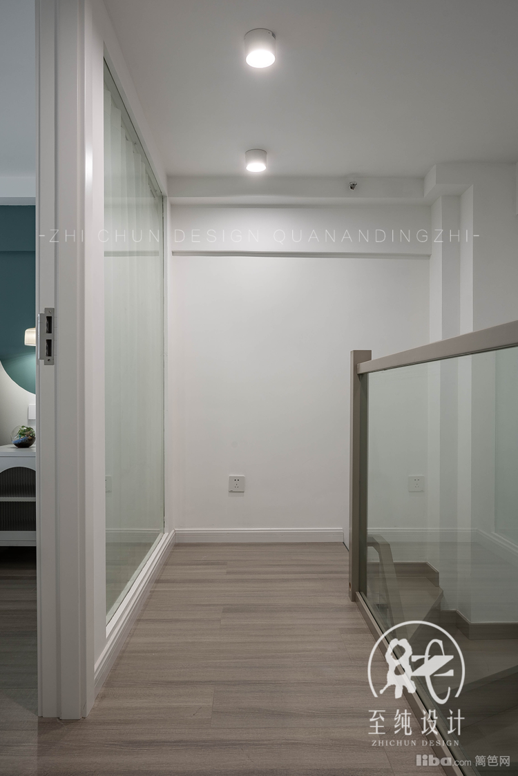 次卧借用玻璃材质的特殊性做隔断墙,增加空间通透性的同时,也借光给予过道更明亮舒适。