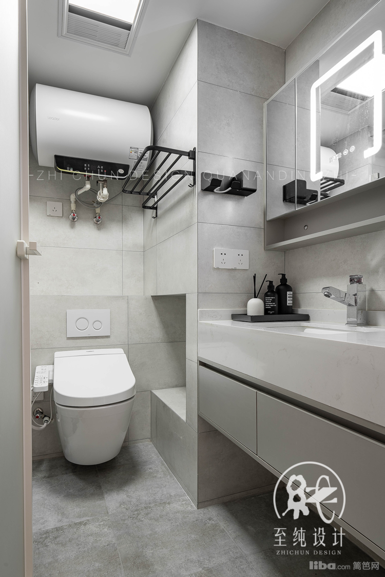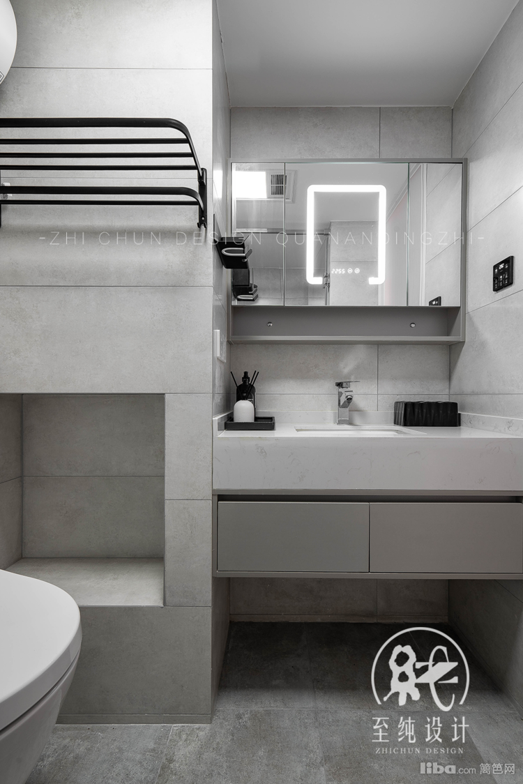 选用灰色系仿古瓷砖,耐看耐脏两不误;自带光环的镜柜增强卫生间洗漱用品的收纳,悬空台盆柜拒绝卫生间死角
